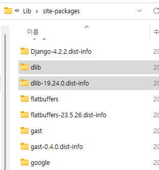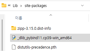 site-packages에 그대로 압축을 풀어주면 가상환경의 파이썬 실행에서 dlib 라이브러리가 불러와진다.