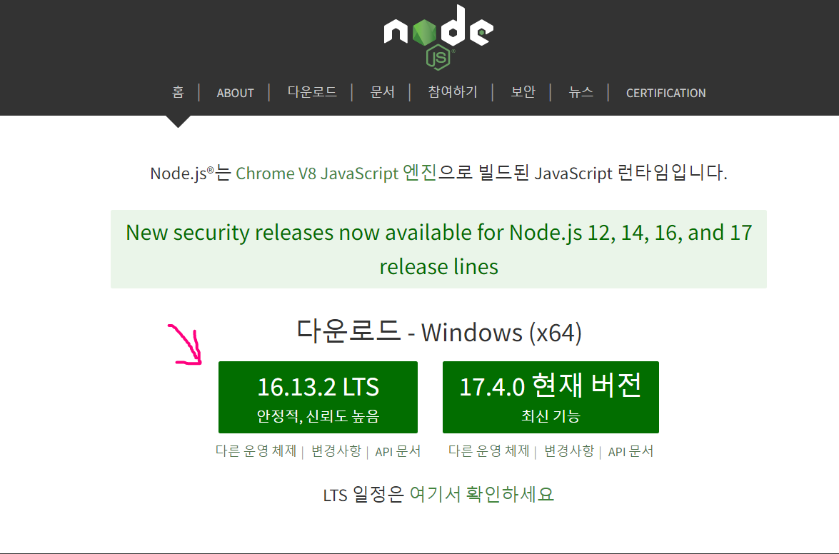 아니.. node.js 강의들 보면 최신버전이 좋다고 다들 최신버전 설치하라고 하더만... 역시 개발 쪽은 최신만이 답은 아닌 것 같다.