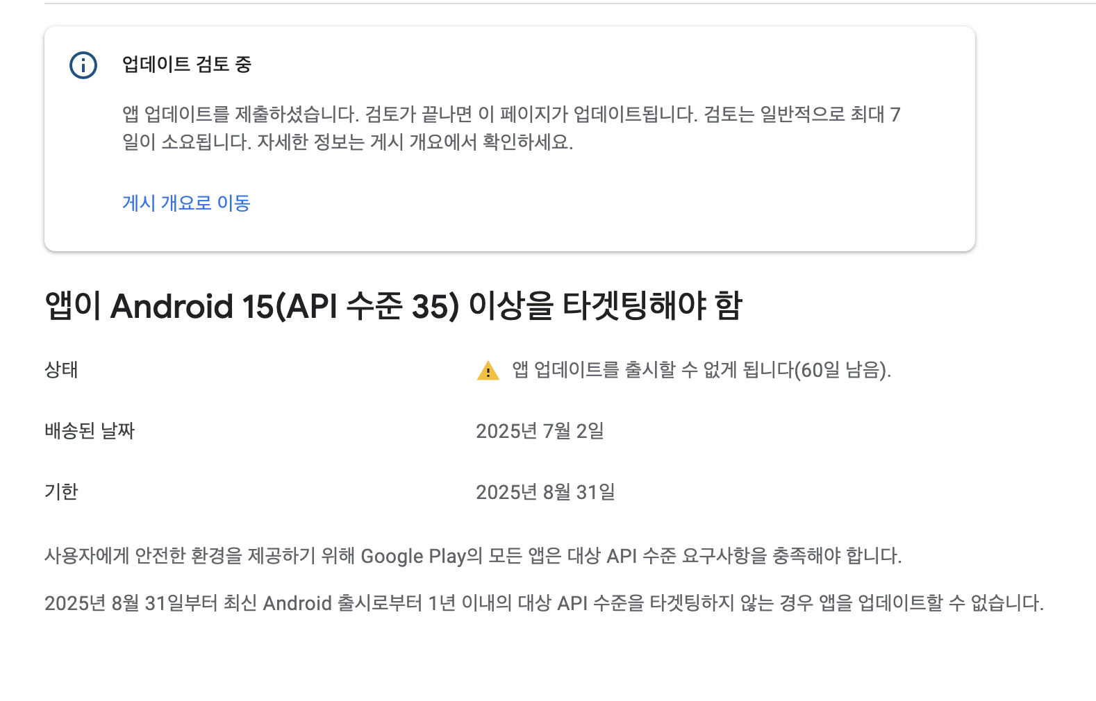 현재까지 앱을 잘 올리다가 경고 메시지가 날아왔다.