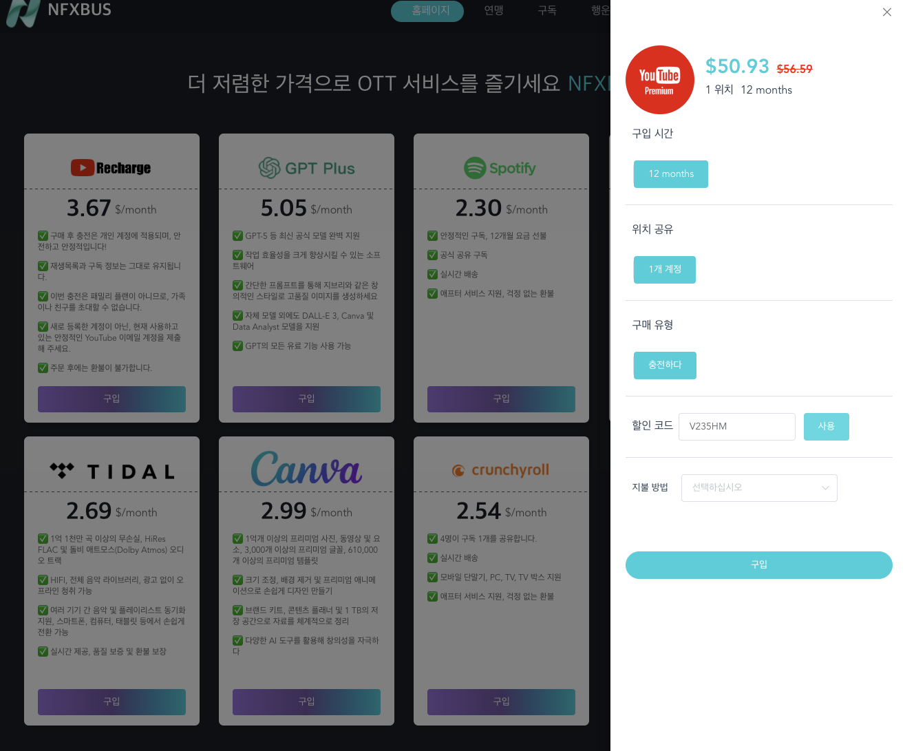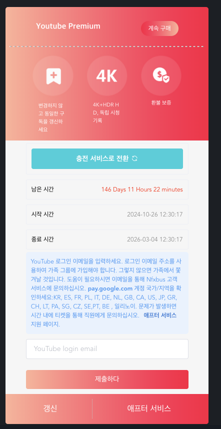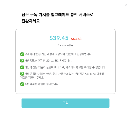 구글이 정책이 바뀌면서 편법 규제가 강해졌는데 최근 다른 구독 공유사이트에도 Youtube Recharge 라는 것이 생기더니