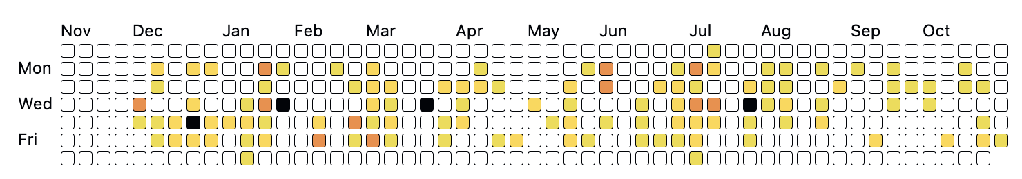 하루에 몇번씩이나 커밋을 하는데 너무 듬성듬성 비어있길래 내 설정이 잘못되어있는가 했는데 아무리 봐도 잘 설정이 되어있는거다.