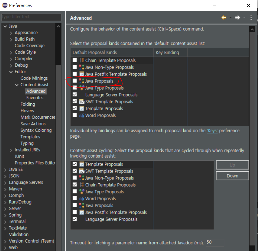 에 들어가보니 Java Proposals가 체크가 되어 있지 않았다.