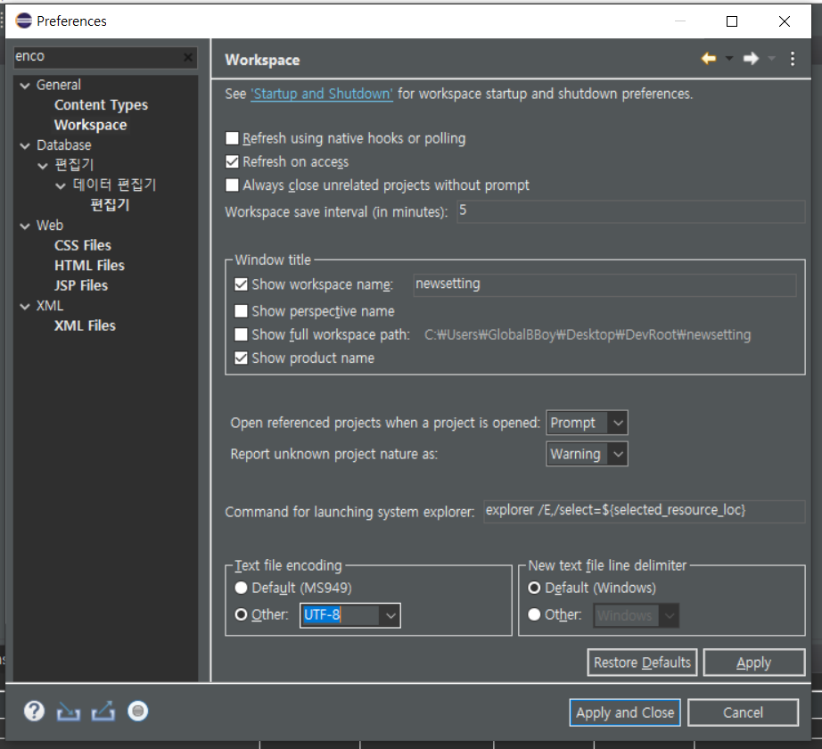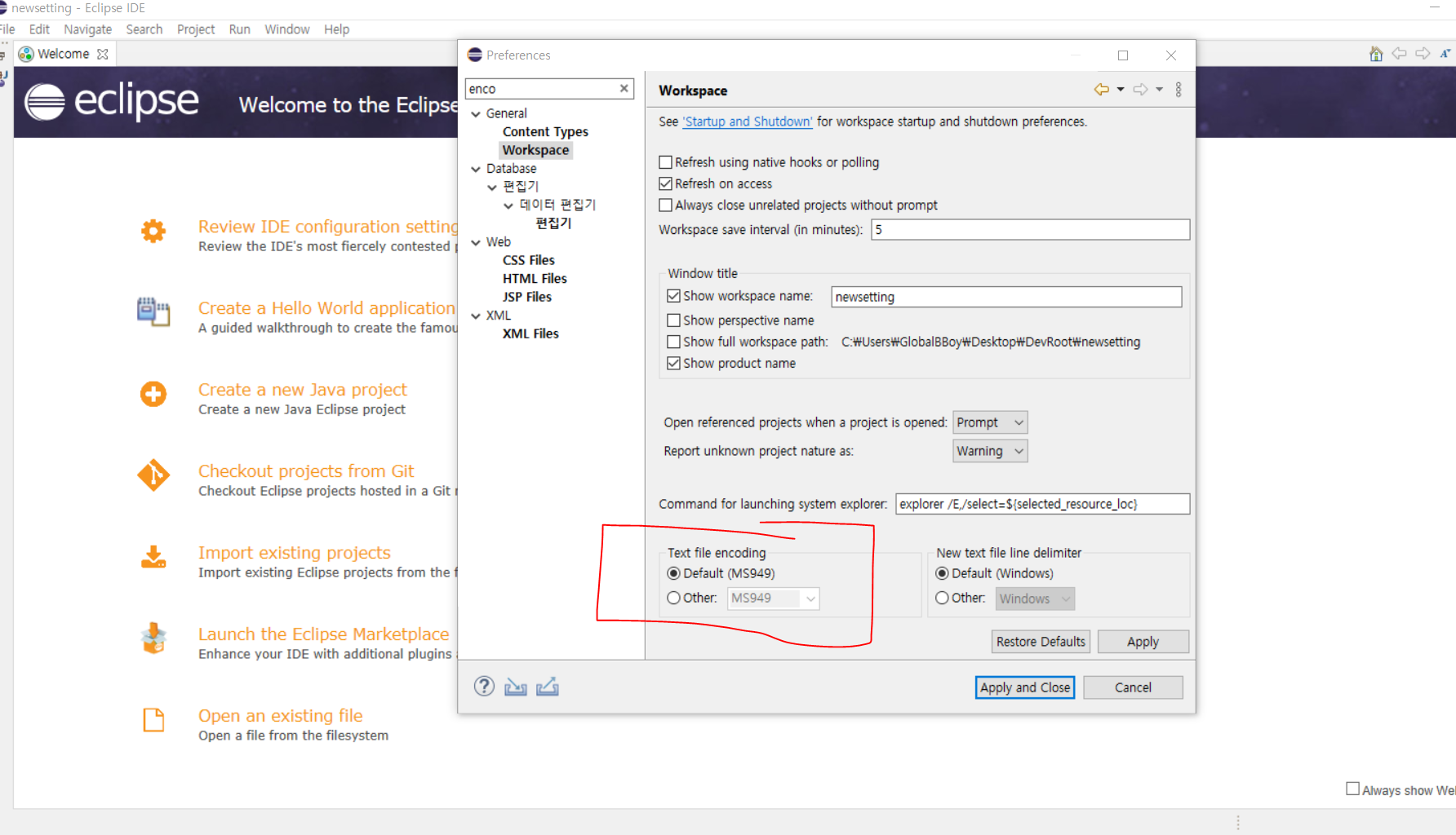 처음 이클립스를 실행시키면 기본적으로 눈이 아픈 흰 화면에 문자 인코딩이 기본값으로 MS949로 되어있다.
