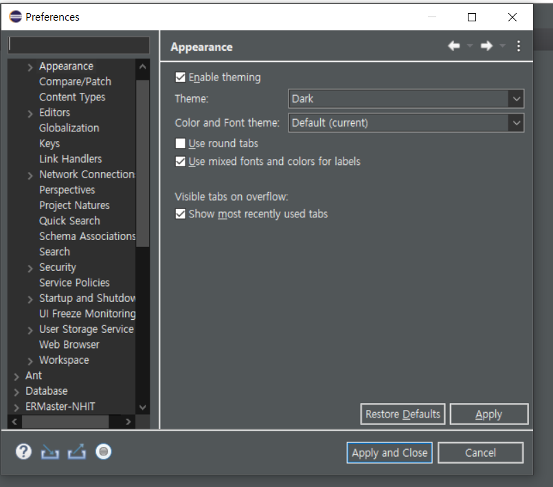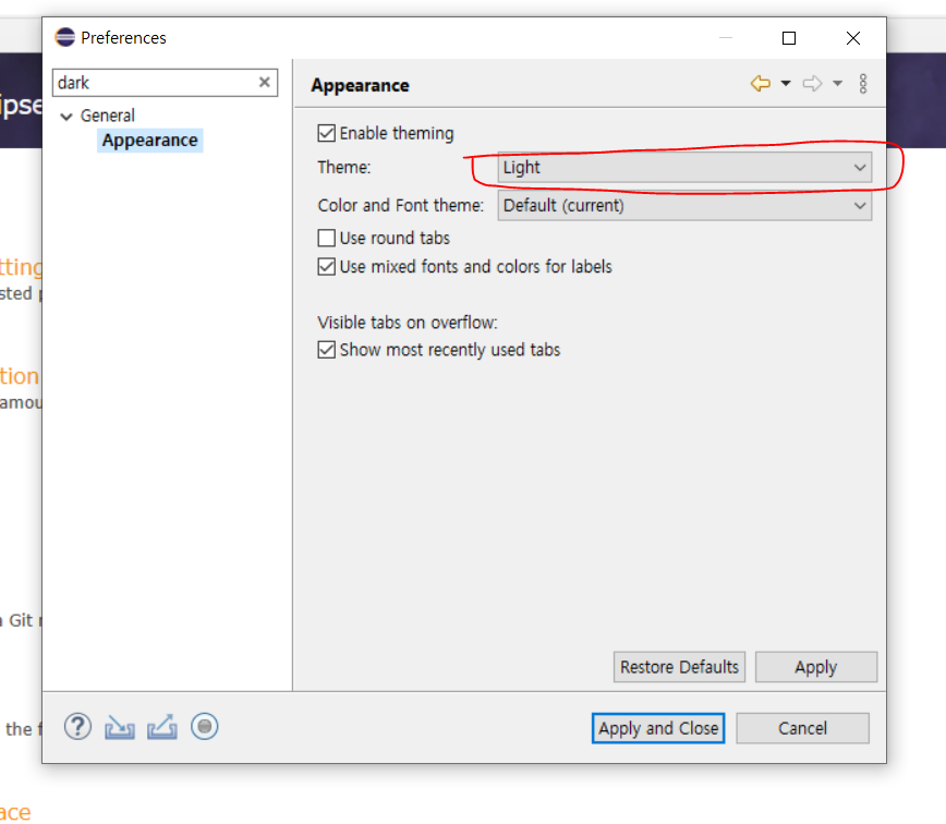 General - Appearance 에 가면 테마를 바꿀 수 있다. Dark로 바꿔주자