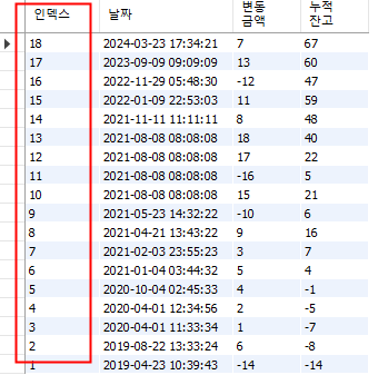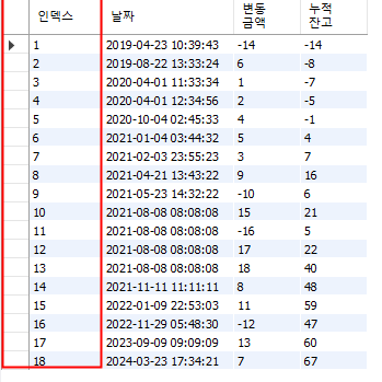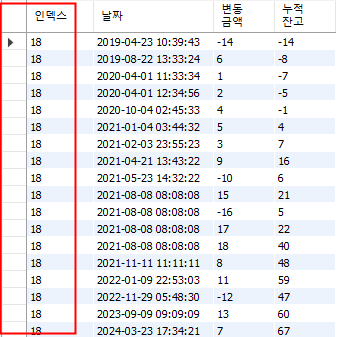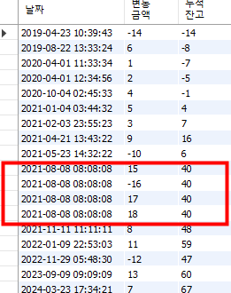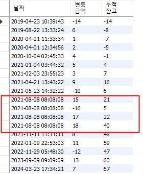 날짜(balance_date)가 겹칠때는 변동금액이 달라도 누적이 하나하나 변하는 게 보이는 게 아니라 한꺼번에 보이게 된다.
